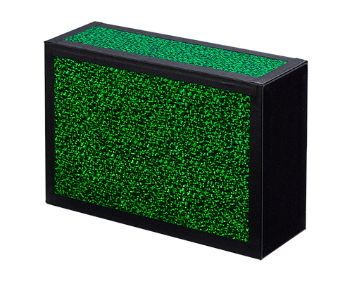 Dekoriert mit Brokatdeko, auf der Stirnseite mit schwarzem Filz beklebt, die Seitenkanten sind mit schwarzem Gewebeband abgeklebt.