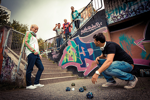 Boule entdeckt die dritte Dimension und verlässt das klassische Sandfeld. Ob vom fünften Stock in den Hinterhof oder über eine Wand als Bande auf die Treppe - der Kreativität sind bei Crossboccia® keine Grenzen gesetzt! Vorsprünge, Fensterbretter, Brunnen oder Parkbänke sind jetzt deine Verbündeten im Kampf um den Sieg. Unsere mit Granulat gefüllten Crossboccia®-Bälle sind für die hohen Ansprüche eines Outdoor-Trendsports konzipiert. Und nach einer matschigen Session lassen sich die Bälle problemlos per Handwäsche reinigen, damit die farbenfrohen Designs wieder zum Vorschein kommen! Der erste Trendsport FÜR JEDEN! Crossboccia® ist der Trendsport für Jedermann! Wie extrem du spielst, entscheidest du! Alter und Fitnessgrad spielen bei unserem Funsport deshalb keine Rolle. Die Devise lautet ganz klar „Easy to learn, hard to master“. Bist du bereit? GET SOME BALLS! Die Crossboccia PRO-Serie besticht mit freschen Designs und extremer Qualität. Die ultra robusten PRO-Bälle sind perfekt für jedes Pflaster, schwimmen auf Wasser und springen sogar von Wasseroberflächen ab! Ob auf Treppen, über eine Wand als Bande oder vom 10. Stock in den Hinterhof die PRO-Serie ist das optimale Sportgerät der freestyle Version und auch für offizielle Turniere zugelassen.