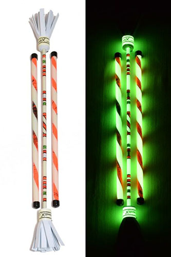 Die Handstäbe sind aus 10 mm dicker, starrer, unzerbrechlicher Glasfaser gefertigt und passend zu den Farben des Flowersticks, die auch mit im Dunkeln leuchtenden Dekorationen versehen sind.