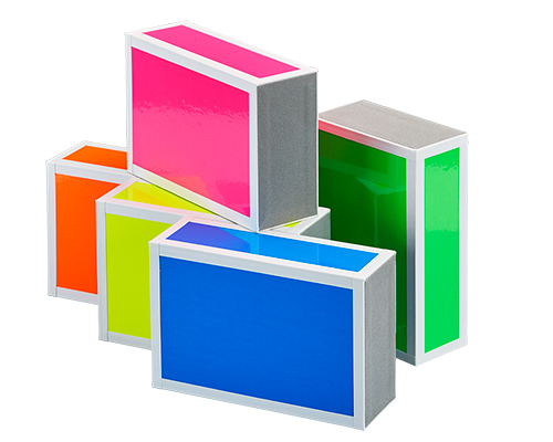 Dekoriert mit Neonfolie, auf der Stirnseite mit grauem Filz beklebt, die Seitenkanten sind mit weißem Gewebeband abgeklebt.