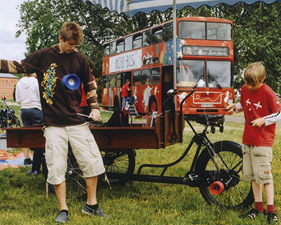 Er ist eine mobile Jonglierschule – in und um Karlsruhe. Er ist jedoch nicht nur ein Blickfang. Das Fahrrad mit seiner Frontladefläche und seine Jongleure rollen unter dem Motto „Spielen, jonglieren, Spaß haben“ zu jedem Ort, zu dem sie gerufen werden. Im Gepäck haben sie alles, was eine fahrbare Jonglierschule für die jungen und alten, kleinen und großen Schüler braucht – und auch zum Staunen für die Zaungäste.