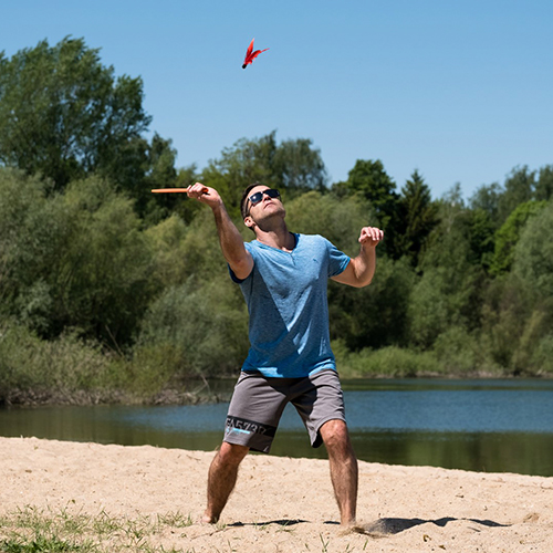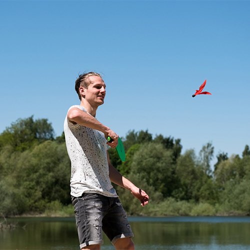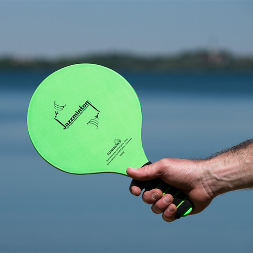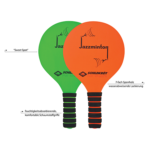 Ein ganz besonderer Sound, eine präzise Flugkurve und die LED Nachtspieloption sind die Besonderheiten des neuen Jazzminton Sets von Schildkröt Funsports. Beim Aufprall des Balles erzeugt der Rebound-Effekt der sogenannten „Birdies“ ein völlig neues Spielerlebnis, sie springen ab wie ein "Flummi". Durch eine spezielle Anordung der Federn wird der Ball in Eigenrotation versetzt. Es entsteht eine sehr stabile Flugkurve der Birdies, die Jazzminton zum Spaß für Jedermann macht. Das Set kommt in verschiedenen Ballvarianten und ermöglicht Spieldistanzen von 1,5m bis 10m. Drei verschiedene Birdies bieten alle Extras für Einsteiger (rote Federn - langsam), geübte Spieler (gelbe Federn – schnell) und den LED Ball für das Spiel bei Dunkelheit (orangefarbene Federn). Dabei lässt ein LED-Licht im Kopf des Birdie beim Auftreffen auf den Schläger leuchten durch einen Bewegungssensor - nach ca 10 Sekunden erlischt das Licht dann wieder. So kann jederzeit das In- oder Outdoorspiel beginnen, ob ganz ohne Netz oder als Battle mit einem Federballnetz. Immer und überall. Und mit deutlich mehr Spiel-Spaß als bei jedem anderen Beachball-Set!