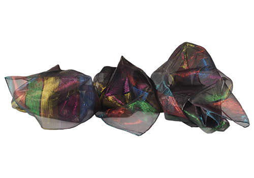 Jongliertuchset bestehend aus 3 verschiedenfarbigen Jongliertüchern in dunkel gehaltenen Glitterfarben.