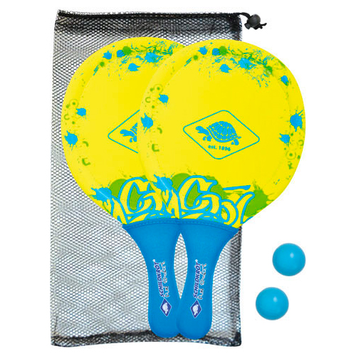 Die Schläger sind mit elastischem Neopren bespannt für maximalen Katapult-Effekt (Länge 40 cm, Breite 22,5 cm, Stärke 0,8 cm), 2 Bälle aus Gummi (Ø40mm), in wiederverschließbarer Netztasche mit Kordelzug. Im Vergleich zu den altbekannten Holz-Beachball Sets bestechen die Neopren Beachball Sets durch einen deutlich weiteren Ballflug durch den hohen Trampolineffekt des elastischen Neoprens. Auch die "Lärmbelästigung" am Strand ist geringer. Gleichzeitig ist das Neopren ein sehr angenehm weiches und griffiges Material. Der Schläger liegt gut und angenehm in der Hand. Das Neopren und auch der Kunststoff-Kern sind (salz-)wasserfest. Im Gegensatz zu den Holzsets kann dieses Set auch mal nass werden, ohne kaputt zu gehen. Wie immer bei Schildkröt ist das komplette Set in einer wiederverschießbaren Netztasche mit Kordelzug verpackt. So kann nach dem Spiel wieder alles schön aufgräumt werden und nichts geht verloren!