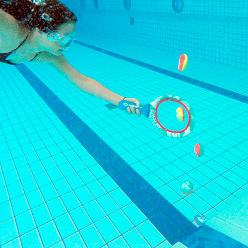 Jetzt wird abgetaucht: Das Diving Game Catch testet eure Reaktionsgeschwindigkeit unter Wasser! Mit dem Kescher müsst ihr versuchen die sinkenden Gewichte im Wasser zu fangen. Aber aufgepasst: Die 5 Tauchgewichte in unterschiedlichen Farben (ca. 100g, 70g, 45g / Ø 7cm) haben 3 verschiedene Punktzahlen. Die Gewichte mit den höheren Punktzahlen sind schwerer und sinken schneller. Geht also taktisch vor und schnappt euch schnell die maximalen Punkte.
