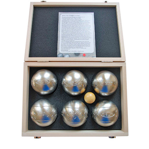 Holzkoffer mit 6 (2 x 3) Freizeitkugeln OBUT INOX (Muster Tatou/Chevron), 1 Zielkugel, Spielanleitung
