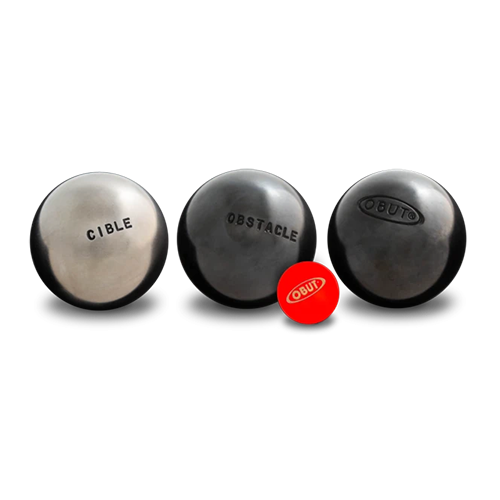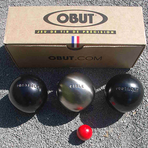 - 2 dunkle Hinderniskugeln(obstacle) und 1 Zielkugel (cible) im Durchmesser 74mm und Gewicht von 700g; 1 hölzerne Zielkugel (Buchsbaum, rot, 30mm)