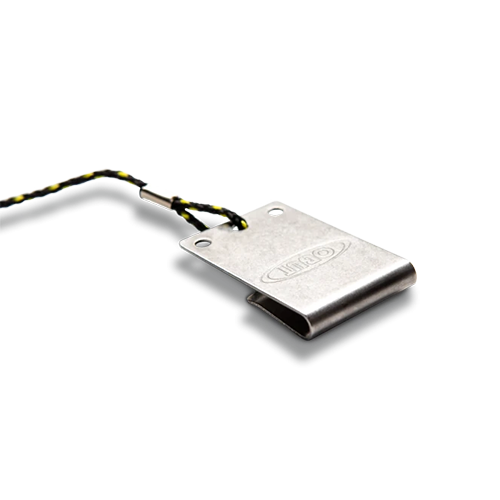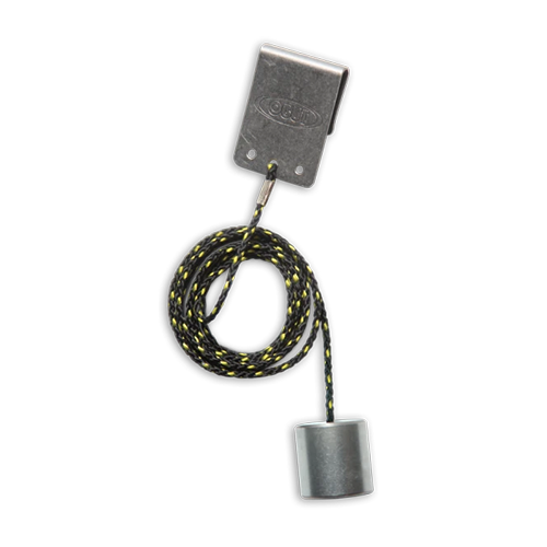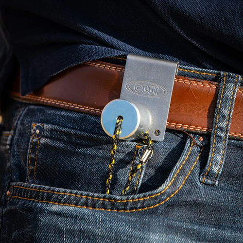 Der Magnet und der Clip aus Metall mit OBUT Logo sind an den Enden einer schwarz-gelben Schnur befestigt, Ø 2 mm, sehr robust.