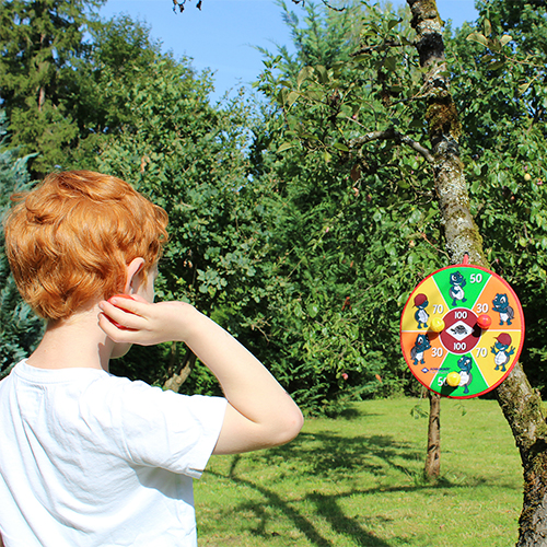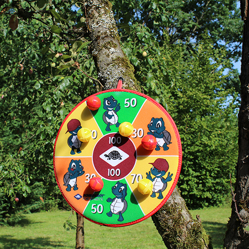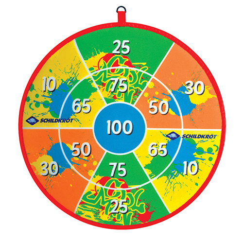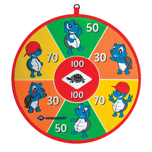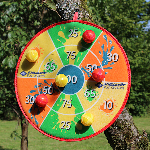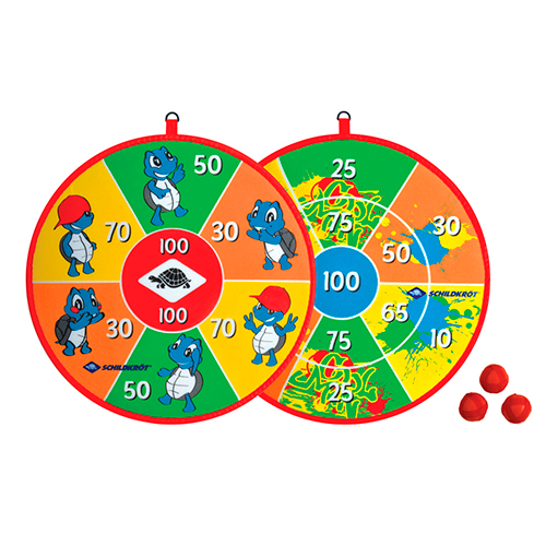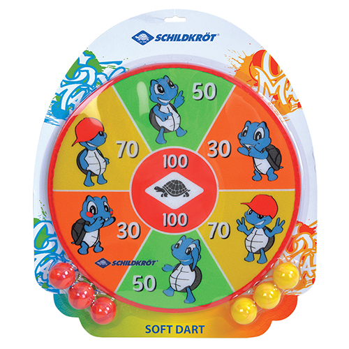 Das neue Schildkröt Soft Dart Set besteht aus einer Klett-Dart-Scheibe (Ø 38cm), die beidseitig mit unterschiedlichen Zielfeldern bedruckt ist und von beiden Seiten bespielt werden kann. Mit den Klettbällen (Ø 4cm) wirft jeder Spieler abwechselnd 3 farbige Bälle auf das Ziel, um die höchsten Zahlen zu treffen. Nachdem die Zahlen addiert wurden, gewinnt der Spieler, der die meisten Punkte erzielt. Die Klettbälle besitzen eine spezielle Kurzklette, die auch bei festem Aufprall auf der Scheibe "kleben" bleibt und nicht abspringt.