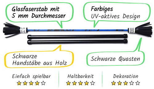 Durchmesser der Sticks: 5 mm Flowerstick, 10 mm Handstäbe