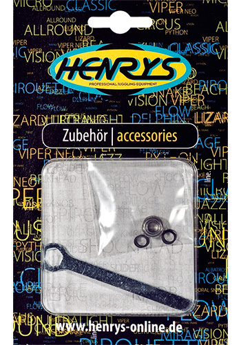 Ersatzteilset bestehend aus vier Unterlegscheiben, einem Ersatz-Kugellager und einem Schlüssel.