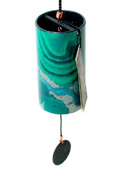Der Korpus besteht aus einer zylindrischen Resonanzröhre, die mit einem wunderschönen Farbverlauf dekoriert ist. Am unteren Ende der Röhre ist eine Metallplatte eingearbeitet, auf der 8 präzise gestimmte Klangstäbe in einem Kreis senkrecht in Silber aufgelötet sind. Durch Bewegung schlägt ein Klöppel an die Stäbe und erzeugt einen sphärischen und lieblichen Klang.