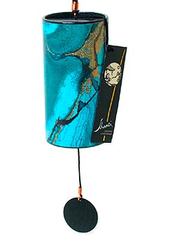 Der Korpus besteht aus einer zylindrischen Resonanzröhre, die mit einem wunderschönen Farbverlauf dekoriert ist. Am unteren Ende der Röhre ist eine Metallplatte eingearbeitet, auf der 8 präzise gestimmte Klangstäbe in einem Kreis senkrecht in Silber aufgelötet sind. Durch Bewegung schlägt ein Klöppel an die Stäbe und erzeugt einen sphärischen und lieblichen Klang.