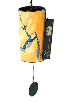 Der Korpus besteht aus einer zylindrischen Resonanzröhre, die mit einem wunderschönen Farbverlauf dekoriert ist. Am unteren Ende der Röhre ist eine Metallplatte eingearbeitet, auf der 8 präzise gestimmte Klangstäbe in einem Kreis senkrecht in Silber aufgelötet sind. Durch Bewegung schlägt ein Klöppel an die Stäbe und erzeugt einen sphärischen und lieblichen Klang.