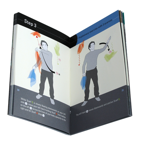 Set of three neon juggling scvarves (100% Polyamid, 65cm x 65cm) and a 64(!)-page tutorial manual.